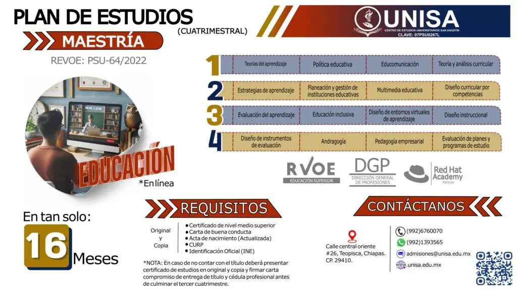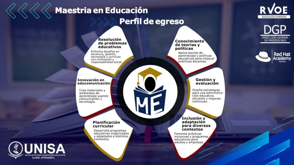 El egresado de la Maestría en Educación de UNISA es un profesionista con sólida formación pedagógica capaz de analizar y aplicar teorías del aprendizaje, comprender las políticas educativas nacionales e internacionales y contribuir a la mejora de los procesos educativos desde la docencia y la gestión escolar.